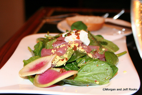 The Spinach Salad was light and fresh, and I was delighted by the large pinkish vegetable that topped its presentation. I learned that it was a slice of watermelon radish. Milder than it’s common garden cousin, it had a slight sweetness with a peppery finish. It perfectly complimented the sweet-tang of the pickled onions and the mustard vinaigrette against the mild spinach.