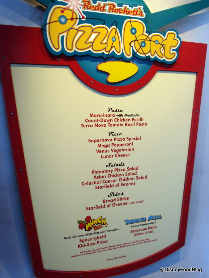 The first thing you’ll realize when choosing your food from the Pizza Port is that the space port themeing is reflected even in the menu. From Mars-inara with Meatballs, Venus Vegetarian pizza, and Celestial Caesar Chicken Salad to the “Space-ghetti” on the kids’ menu, ordering your food is going to make you feel like a kid again — like it or not. 😉