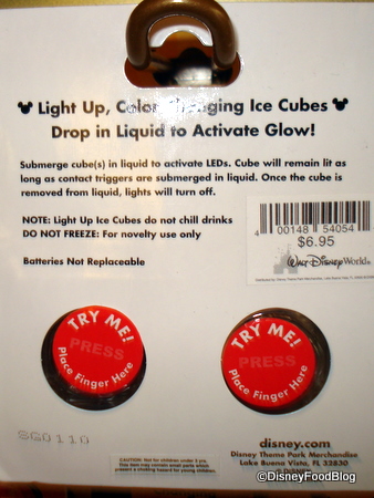 Speaking of the light-up ice cube, if you’re averse to taking the one out of your drink and sticking it in your pocket (which is what you’re expected to do, by the way — it’s re-usable!), you can always buy your very own light-up cubes in several Disney parks gift shops and stores. Note: They’re not the same cubes that are served in the drinks in Disney’s lounges and restaurants. The cubes found in Disney’s shops light up when submerged in liquid and turn off when taken out of liquid. I found these in the Emporium at the Magic Kingdom in Disney World: