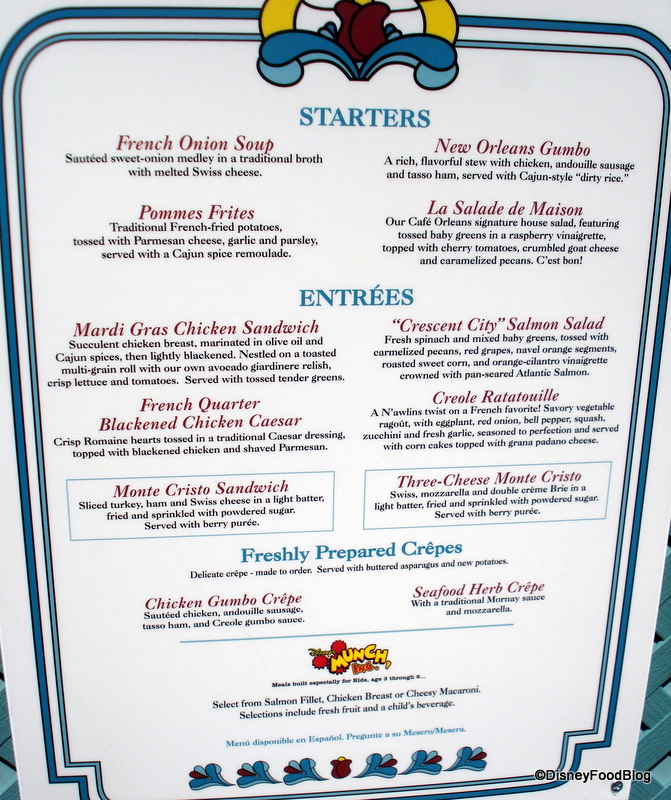 We have been to Cafe Orleans serveral times it is always wonderful, my DH & I were there for our Anniversary and I had the Onion soup, I must always have this, and the “Blackened chicken ceasar salad” it was good but nothing spectacular, My DH had the “Ratatouille”, he had to try it because of the movie, and loved it! He also had the gumbo and it was excellent. I always must save room for the “Mixed berry crepes” they are my favorite, the server who seen we had our Anniversary badges, brought out a complimentary order with two Mickey Beignets they were great, but we were already so full we only ate one. Everything there is wonderful and the service is exceptional! the outside dining and people watching is great also we got to watch the “Marde Gras” perfomance, we will be back!