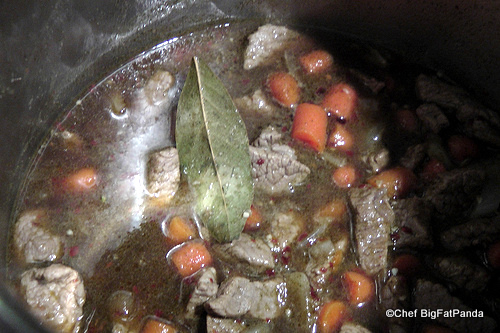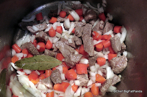 1. Sear sirloin cubes in a large stock pot in a small amount of olive oil, add the bay leaf.