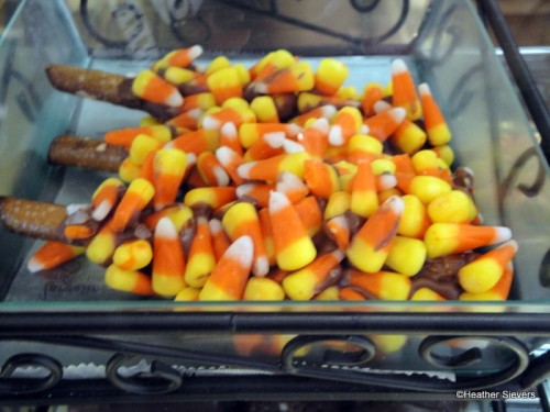 Our personal favorite is the candy corn shaped rice crispy treat. It’s soft and gooey; with a top coat of colored chocolate and well, just plain divine.