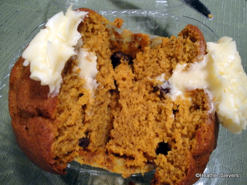 Honestly, this “muffin” seems more like a cupcake to me. It size is enormous, it’s super moist, and it has the perfect amount of pumpkin flavor. Not too overpowering, just right. The batter also has plump sweet raisins in it which was a great surprise.