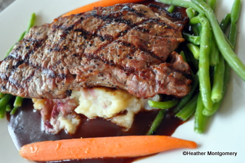 About five minutes later, our entrees were placed in front of us. Being the meat and potatoes girl that I am, I of course got the New York Strip Steak with mashed potatoes. The meat was good, but slightly fattier than I like. It was, however, cooked how I asked, which I feel can be hit or miss in Disney restaurants. The potatoes were creamy and buttery, and went very well with the steak. This entrée also came with seasonal vegetables.