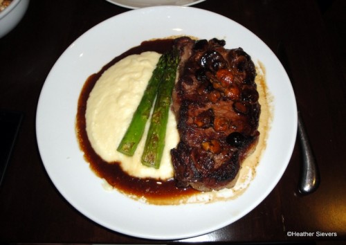 Now, my husband’s dinner on the other hand was fantastic. He ordered the New York steak and had no problem cleaning his plate. The Catal menu has 4 different steaks to choose from: prime rib (either 12 or 16 ounces), filet mignon, rib eye, and New York. All steaks are served with fontina cheese mashed potatoes, which I helped him eat — so great — asparagus, and roasted mushroom red wine jus.