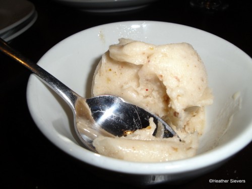 Another dessert menu item is the “sorbet” of the day. The chefs make a unique flavor each day. Today’s was pear. It sounded so refreshing. Of course we had to order a scoop of that too. It was so fresh it was like eating a frozen pear right from a tree, well, a frozen tree.
