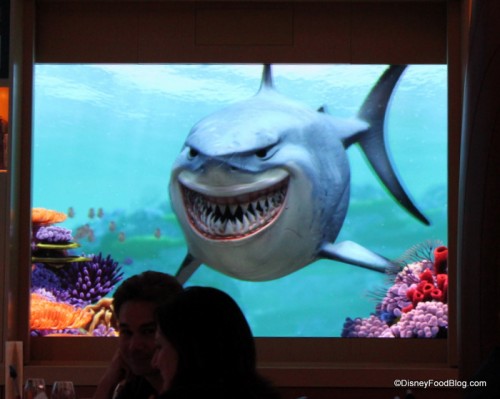 Throughout the meal, some of your favorite characters from Finding Nemo make appearances. Bruce swims up behind you, the silver school of fish play guessing games with the kids in the restaurant, and Crush — the star of Turtle Talk with Crush in the Disney parks — actually interacts with guests!