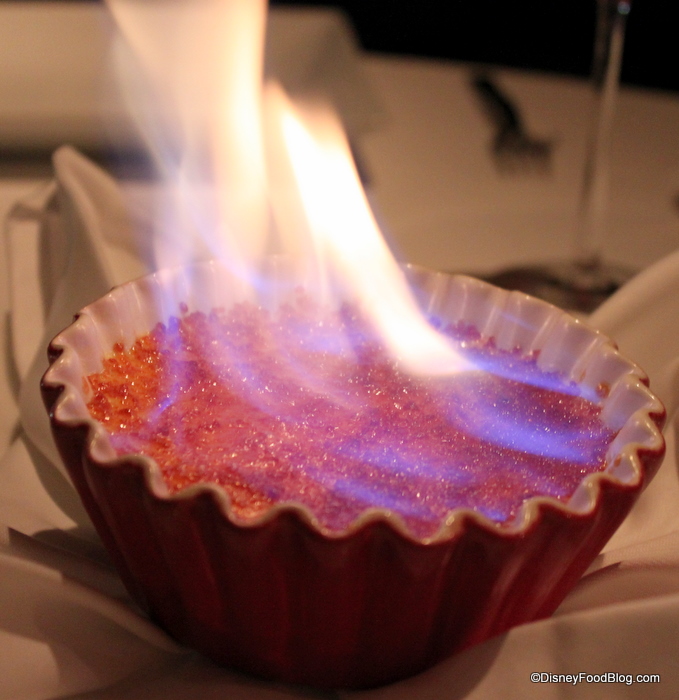 I’ve been noticing some interesting trends at Disney area restaurants lately! I mentioned the gourmet Mac & Cheese trend a while back, but here’s an interesting one that has to do with dessert — flames!