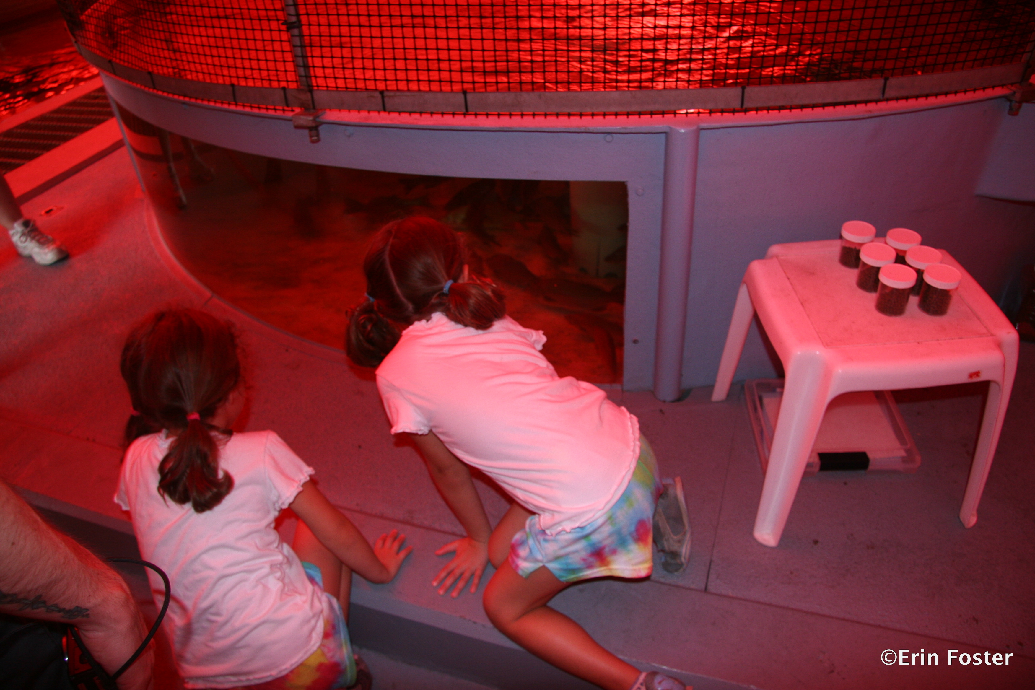 The interactive element of the aquaculture area involves feeding the animals. Guests, including children, are given a handful of nutrition-filled pellets. The first time we took the tour, the pellets were for feeding the alligators. Even though they are little alligators, housed behind a nice glass wall, I found myself to be more than a little jumpy around them. On more recent tours, guests have been instructed to feed their pellets to the fish. This is somewhat like feeding fish in a tank at home, only much, much bigger.