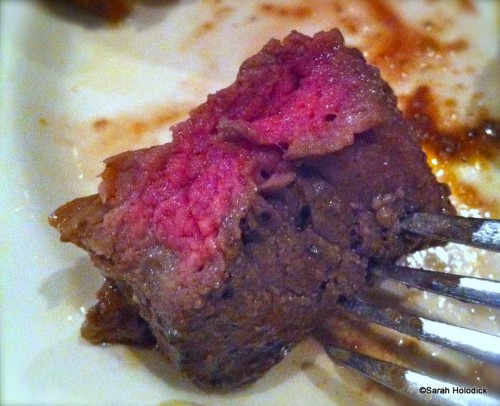 Next came what we thought would be the star of the show, the skewers! We were served Marinated Sirloin Steak, Spicy Grilled Peel and Eat Shrimp, Asian Barbecued Pork Loin, and Oak Grilled Chicken. Matt and I agreed that the steak was our top choice of the four proteins served. It was actually cooked rare! Look at the picture!