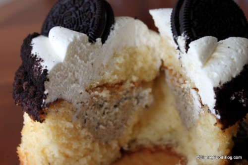 Interestingly, the Oreo cupcake is a yellow vanilla cake (who’d a thunk it?) with vanilla frosting. A ribbon of Oreo crumbs coats the bottom of the frosting, and two little Oreos make a Mickey Mouse out of the whole thing.