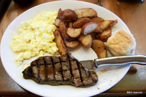 Today, I just had to have the classic Steak and Eggs. Every time I order steak here at the Kona, they always cook it just right! This meal offers a New York Strip Steak with two eggs (your way), home fried potatoes and a biscuit. As always, a great job by the chef!