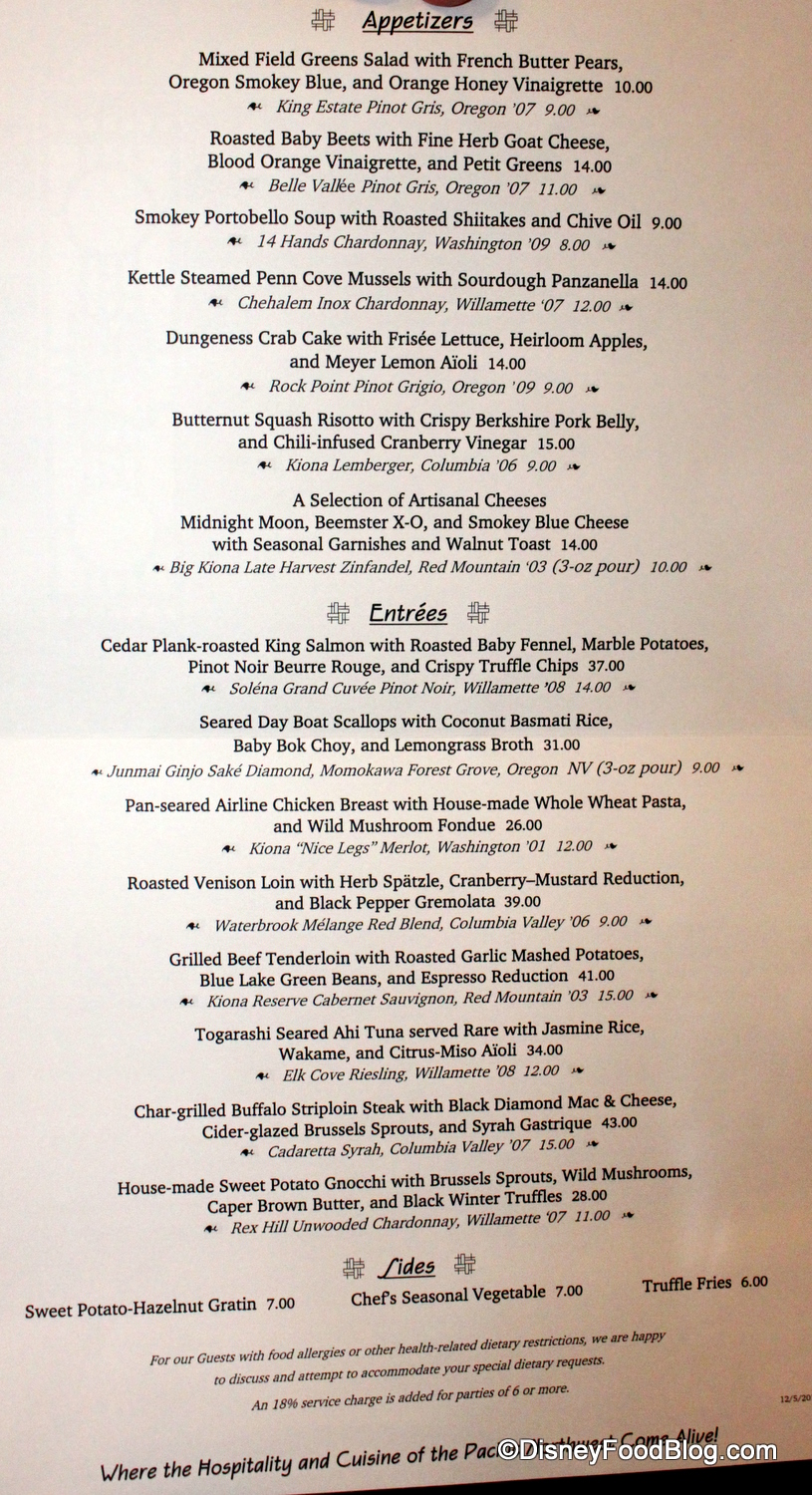 We absolutely love Wilderness Lodge but we had a less than happy ending to our late and romantic meal at Artist Point too. My husband had studied the menu months before our trip and decided on salmon. They were out. They were also out of his second and third choices so he was disappointed before we even got started. Granted we were seated at 9:00 p.m. but still, for what we paid for the meal we were disappointed with the food and service we received.