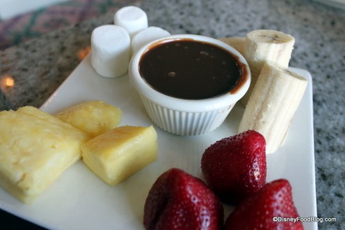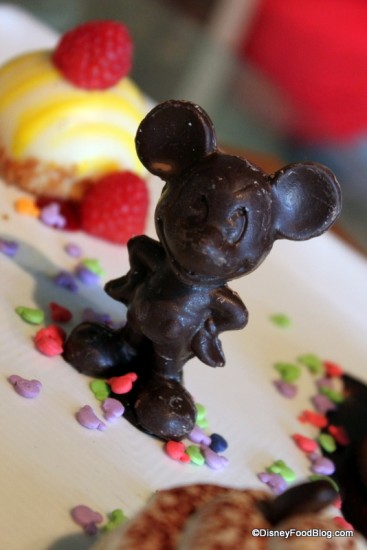 For dessert, there are lots of options, but overall I’d suggest you get either the Dessert Sampler, which has Tiramisu, Chocolate-Hazelnut Mousse Cake, Lemon Cheesecake, and the Key Lime Tart; or the dessert fondue. We ordered the Key Lime Tart and the Lemon Cheesecake thinking we’d get larger portions of each than we would on the sampler. This is not the case, and we ended up spending $7 on two desserts instead of getting four for $10. PLUS, you get a chocolate Mickey. Not fair.
