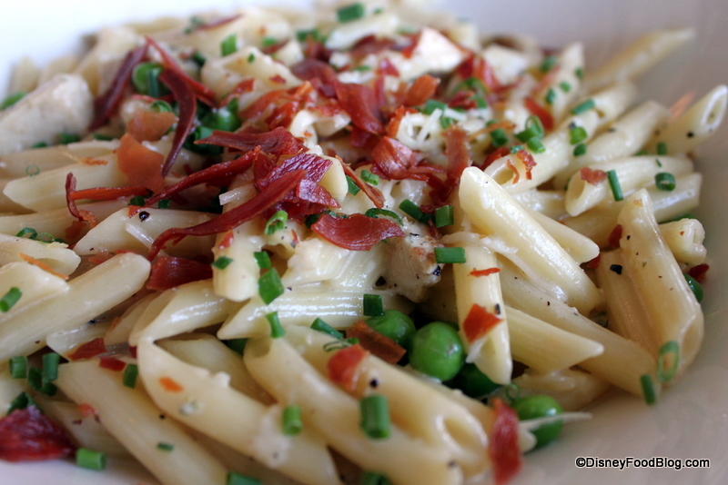 Next up — entrees! We ordered the penne pasta with Asiago cream sauce and peas, substituting chicken for shrimp; and the grilled rib-eye with Parmesan frites and red wine sauce.