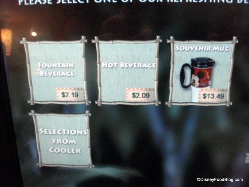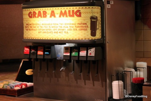 To the side of the restaurant, you’ll find plenty of serve-yourself drink options: coffee, tea, and soda-pop. Don’t forget that you can purchase and refill your resort refillable mug here.