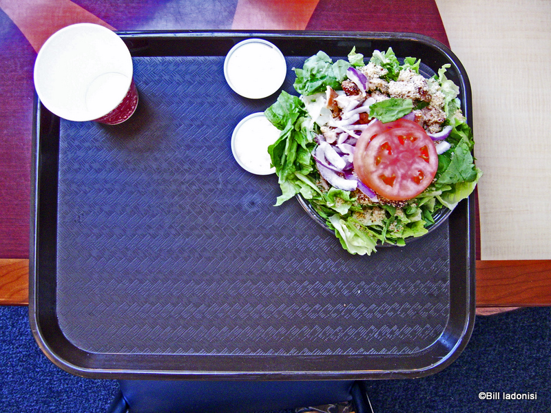 I always love Disney’s salad offerings and today I ordered the Chicken Chop Salad. This salad is nicely presented with an abundant amount of white chicken meat, tomatoes, cucumbers, black beans, corn and a very tasty buttermilk-avocado dressing. And since I love raw onions and tomatoes, the aforementioned condiment station had just the extras I wanted.