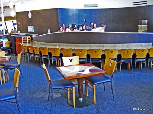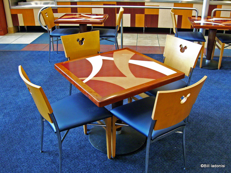 Green, Red and Almond floor tiles along with the Teak wood tabletops and chair backs in honey maple (all with a nice three circle Mickey) give the eatery a “contemporary” look and feel. (I know; I had to say it!)