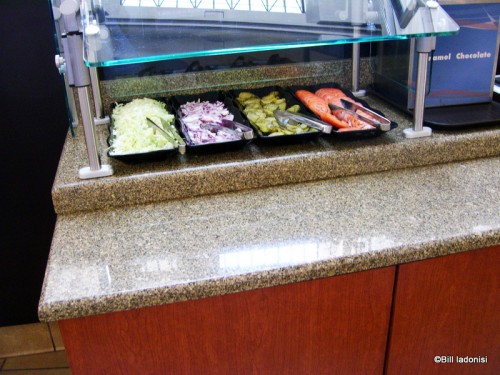 What I really like are the self-serve stations! There is a small condiment station with lettuce, pickles, onions and tomatoes.