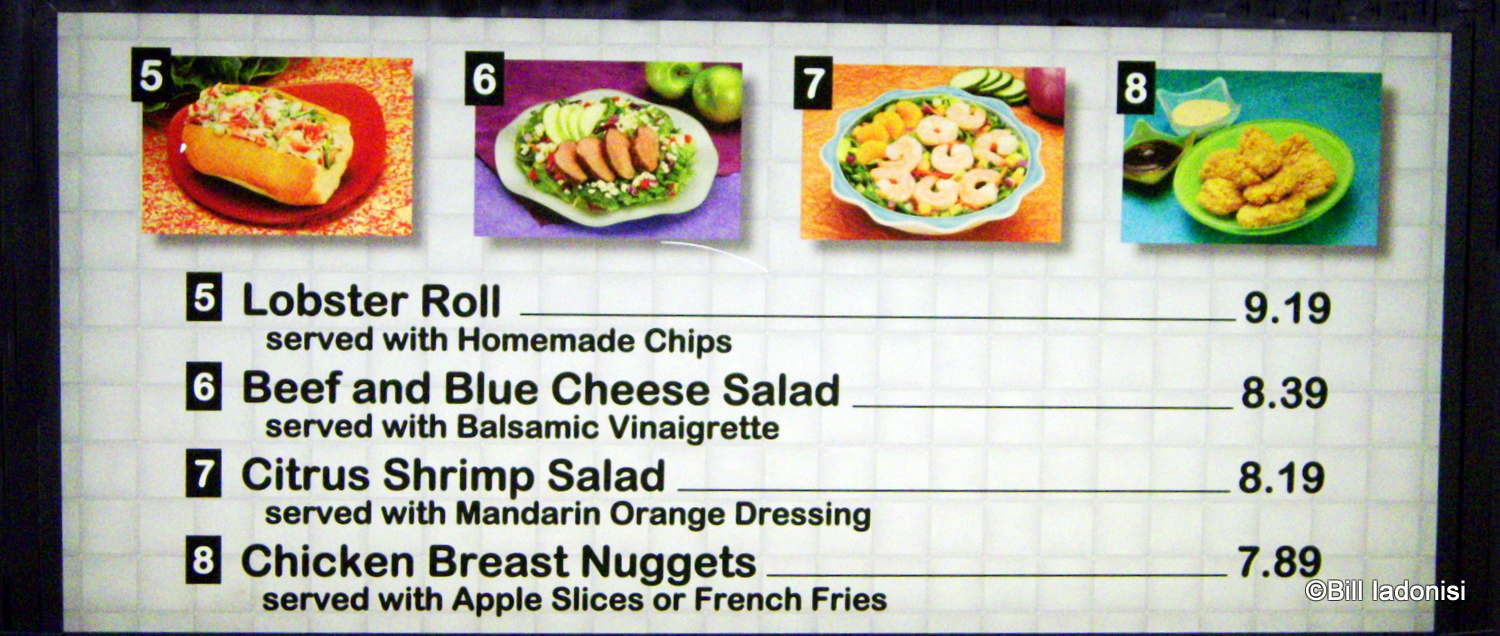 The two previously mentioned pasta dishes, a 1/3 lb. Angus Bacon Cheeseburger ($8.79) and a Fried Chicken Sandwich ($8.79) with choice of apple slices or French fries, give the hungry guest a good choice. Less hungry? Order a Lobster Roll with homemade chips ($9.19) or one of two excellent salads, a Beef and Blue Cheese ($8.39) and a Citrus Shrimp with Mandarin orange dressing ($8.19). And what quick service menu would be complete without Chicken Breast Nuggets ($7.89) — choice again of apple slices or French Fries.