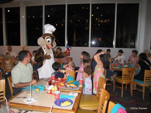 Keep an eye out for where the characters are in the room. If Mickey is within your section of the restaurant, put a hold on trips to the buffet and wait for him to arrive at your table. The waffles will still be there, and having your entire group at the table prevents others from having to wait while you go extract Junior from the dessert station.