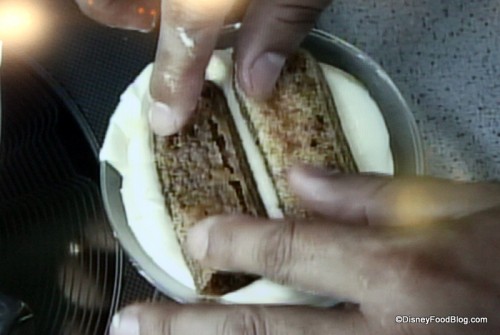 He then smoothed more cream on the top and dusted the whole thing with a thin layer of cocoa powder to finish off the dessert.