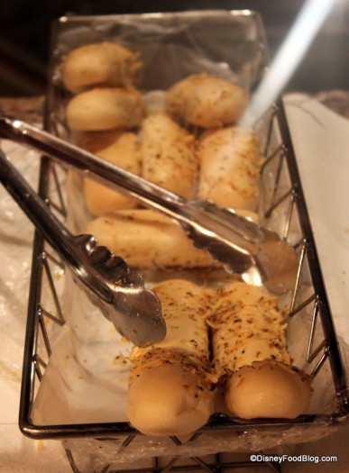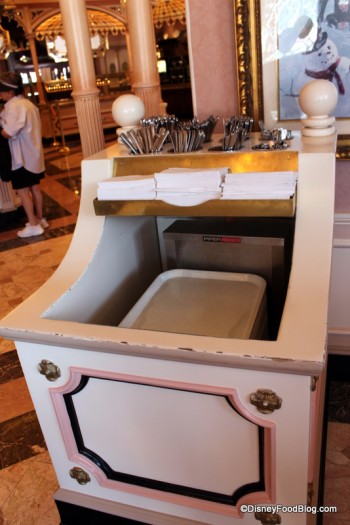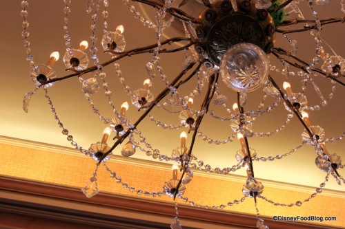 Guests are greeted at the door by a large buffet and an ornate dining room full of velvet curtains, crystal chandeliers, and the kind of opulence you’re not used to seeing at a counter-service location!