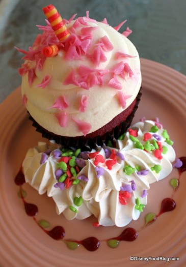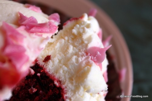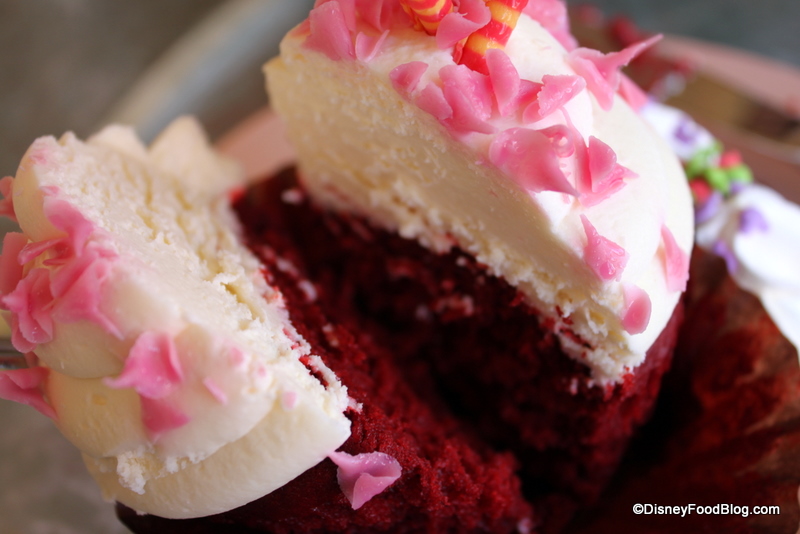 The “frosting” was actually straight cheesecake! Honestly, there wasn’t much “frosting-ness” to the topping, which isn’t necessarily a bad thing if you like very sweet cheesecake! 😉 We asked a cast member on the way out about the “frosting” — she mentioned that it was pretty much just cheesecake…