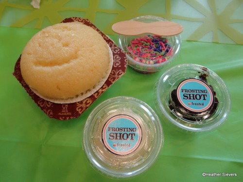 We were each given a cupcake kit from Frosted Cupcakery that included a vanilla cupcake, two frosting “shots” — one vanilla & one chocolate — sprinkles, and a cute little spreader to apply the frosting. My FAVORITE cupcake flavor is vanilla, so I was super excited.