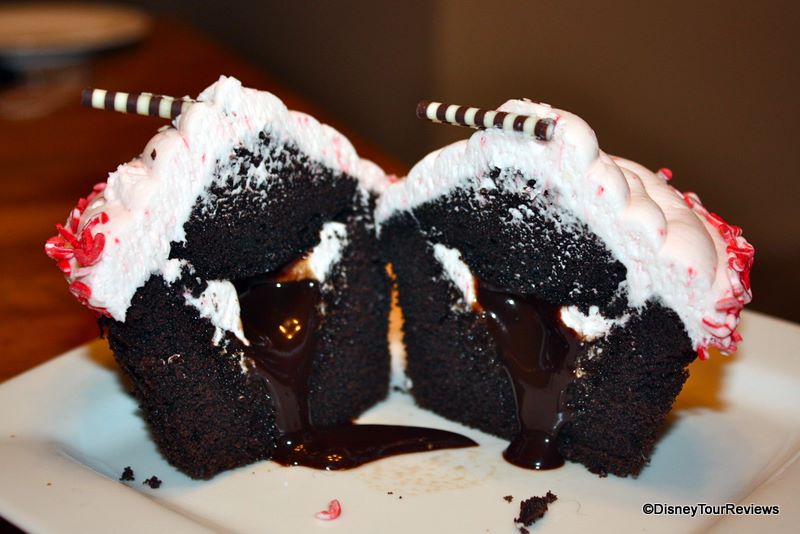 The only slight criticism we have concerns the chocolate syrup center. It was garden-variety chocolate syrup, whereas we would’ve preferred more of a fudge sauce. A thicker center would have been both tastier and less likely to surprise unsuspecting diners with a chocolate waterfall. However, when eaten with the cupcake, the syrup just added to the moistness.