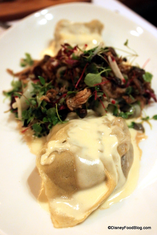 My fiancé and I just ate there two nights ago. For appetizers, we had the Caesar salad (pretty standard but good presentation) and the cheese board (delicious). My fiancé had the filet – he’s sad he just found out now that he could have swapped red wine sauce (too sweet for his taste) for garlic butter. He deemed the mashed potatoes the best he’s ever had. I don’t eat beef and tried their new pasta dish – Sonoma goat cheese arugula tortellini in a pumpkin purée. There was sun-dried tomato mixed in with the goat cheese. The arugula was in the tortellini pasta but was not overpowering. This was THE BEST dish I’ve ever had on property. I wish this would stay on their menu. It makes me sad knowing I may never have it again since the menu changes often. And our server was fantastic – if she saw we were in conversation she would change directions and let us carry on, or take plates without interrupting. Great meal!