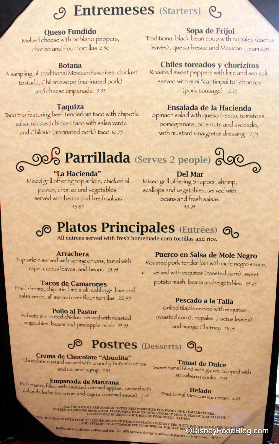 We just returned from our visit on 9/13/13. Our FAVORITE meal of the trip was when my husband and I had a night to ourselves at La Hacienda. We made a late reservation and saw “most” of the fireworks from our booth. The food was SPECTACULAR, the service was great, and the atmosphere was very nice. We ordered the Tequiza appetizer, had the Parrillada Platter and was able to customize it to include – Sirloin, Shrimp, Scallops and Veggies. We didn’t even bother with the tortillas. For dessert I had the Mousse (just ok) and my husband had the sorbet (very good). We actually considered cancelling a reservation we had later in the week so we could go back (but decided against it). On our next trip, this will be the VERY FIRST dining reservation we make!!
