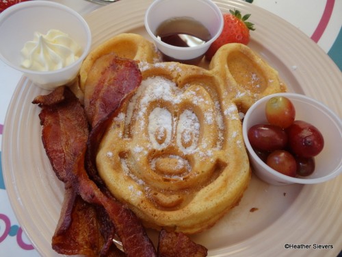 My 7 year old ordered the Mickey’s Junior Waffles off of the kids menu. It came with two mini Mickey waffles and some fruit. We were nice and shared our bacon!