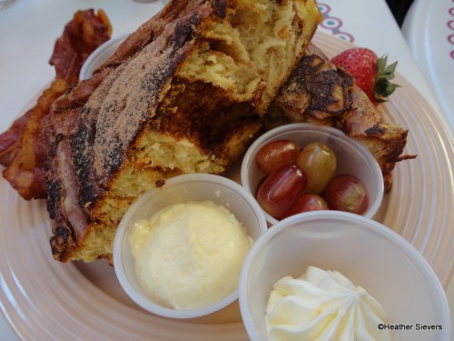 Next up, a Disneyland breakfast isn’t complete without the uber famous Mickey Waffle. My 10 year old ordered the large Mickey Shaped Waffle, which came with the choice of Smoked Bacon or Sausage Links. He went for the bacon, extra crispy. It also came with a cup of grapes and a strawberry.