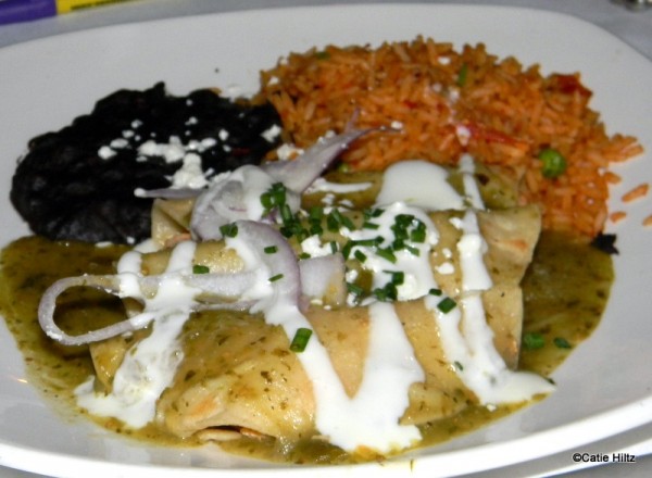 Our meals were brought out about 15 minutes after ordering, which was good timing as we had just finished the chips! When it came to menu choices, my mom and I both had the “Enchiladas Verdes De Pollo” (Chicken Enchiladas).