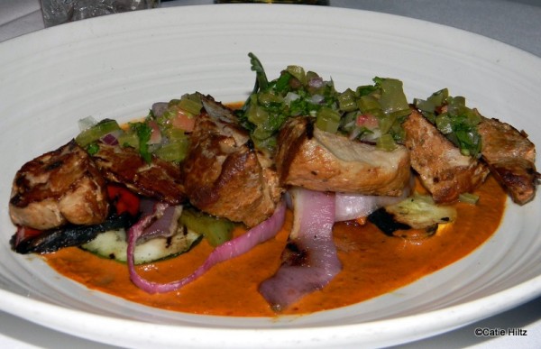 My husband had the “Lomo de Puerco en Pipian,” grilled pork tenderloin served with grilled vegetables –- onions, peppers, squash and zucchini — and topped with a spicy tomato/pepper sauce that had a hint of cinnamon. My husband said the pork was grilled perfectly and the sauce was almost like a gravy that went really well with the meat and vegetables.
