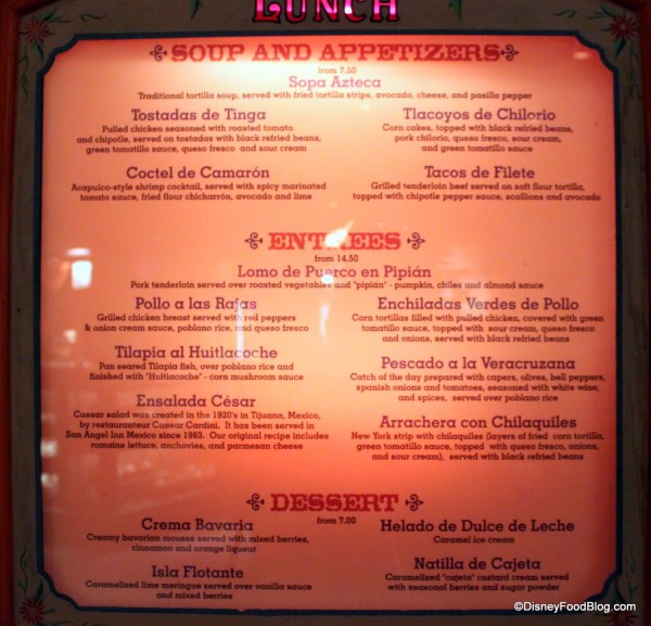 We just ate there in April while on Spring Break. We loved it! The food was great! We did lunch too and with the kids it worked well! The churro dessert was amazing! It’s been on my husband’s top places to try with the ambiance so we finally did it! I can’t remember what we ordered, the menu you posted looks a little slimmer than what we saw but it may not be. Whatever we had it was delicious and the staff was great too!