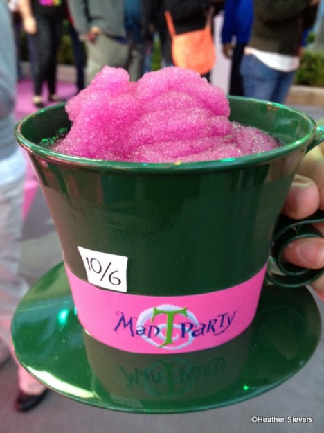 So come on people, mix your “Jabberwocky Juice” and your “Tweedle Blue!” Frozen drink options are: Tweedle Blue (Cotton Candy), Hatter’s Mandarin Fury (Mandarin Orange), Jabberwocky Juice (Granny Smith Apple), and Cheshire Chiller (Desert Pear). In a plain ol’ plastic cup they are $4.19, or you can get them in souvenir cups for $7.19-$7.59.