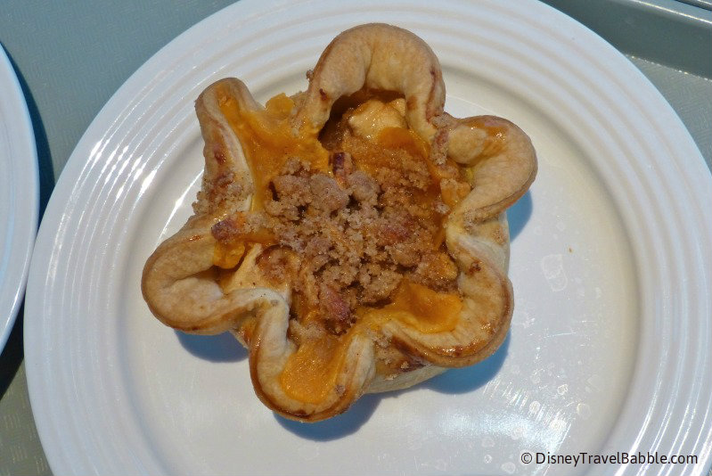My husband’s American Breakfast was exactly what you’d expect: rubbery scrambled eggs; that chewy, translucent Disney bacon; a dry biscuit; and breakfast potatoes flavored primarily by bell pepper. He declared it perfectly adequate but nothing to write home about.