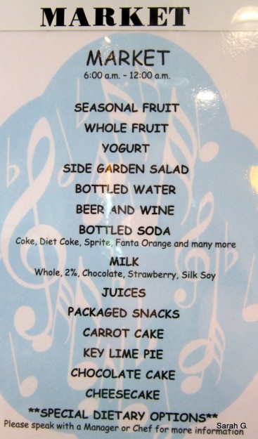 In addition to the counter service stations, there is a grab-and-go area called the Market for small salads, Kids’ Pick sides, fruit, bottled beverages (including some beer and wine selections), and desserts (including cheesecake, chocolate cake, and ice cream).