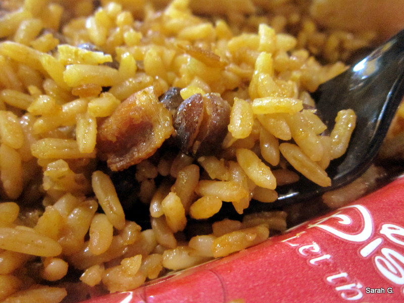 It had good flavor, but it was not as fresh as other dishes I tried. The flour tortilla had a nice crisp to it at first but grew soggy as it sat. The dish is accompanied by rice and black beans, as well as dollops of sour cream, salsa (mild), and guacamole. You can also opt to have the cast member sprinkle to top of your beans with cilantro and raw onion. I felt this addition brought the dish a little life that it otherwise lacked.