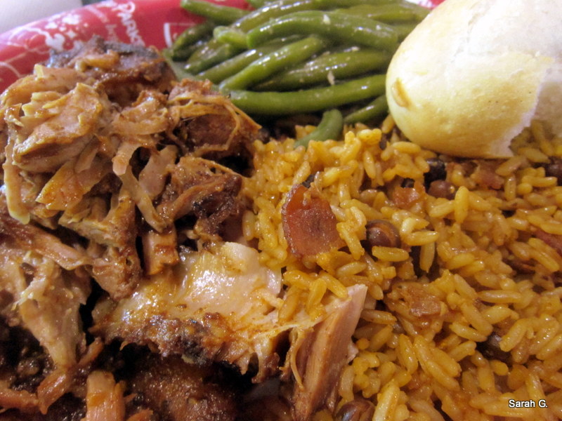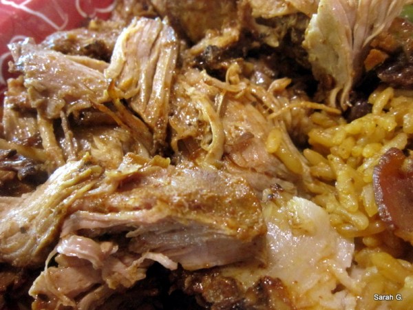 The pork is pulled apart by a cast member who portions out a generous pile. It glistens with juices and has a distinctly garlic aroma. It wasn’t overly salty and had very little fat.