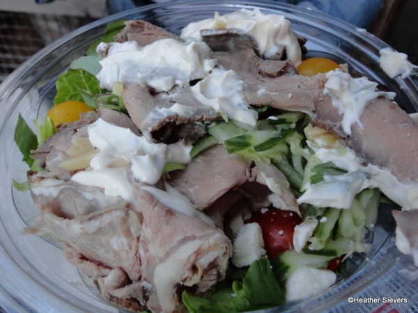 At $9.99 the Steak Salad includes roasted New York Strip on top of greens and hearts of romaine with fresh cucumbers, yellow & red teardrop tomatoes, feta cheese, green onions, and dried cherries with garlic aioli and toasted almonds.
