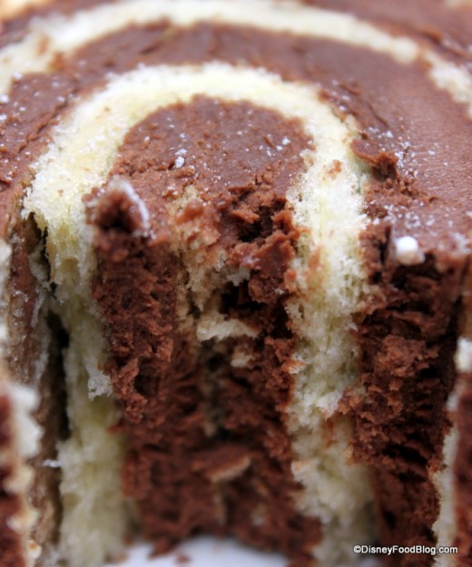 During my regular “casing” of Animal Kingdom on this trip, I found a few new holiday goodies at Kusafiri. There’s a red-and-green frosted chocolate brownie, a few holiday cookies, and the Yule Log, which I couldn’t wait to try!