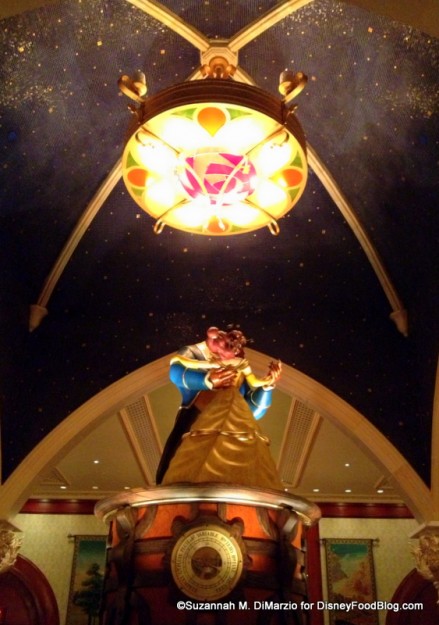 Once inside, you find pretty much exactly what you would expect: low-lighted spaces with beamed ceilings reminiscent of medieval European castles. Enchanted suits of armor guard the long entryway. At the end of the hall, you see the stained glass window depicting Belle and Beast’s famous dancing scene.