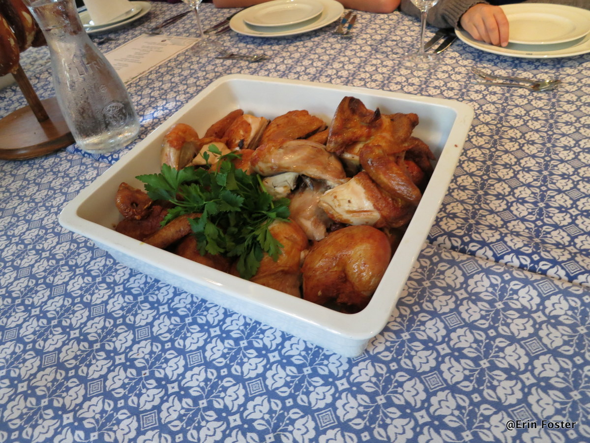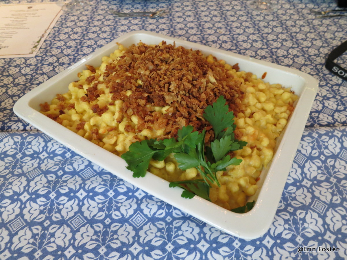 The hearty family-style fare included potato dumplings, potato salad, cheesy spaetzel, pretzels, roast chicken, sausages, and roast pork. With apple strudel and vanilla sauce for dessert.