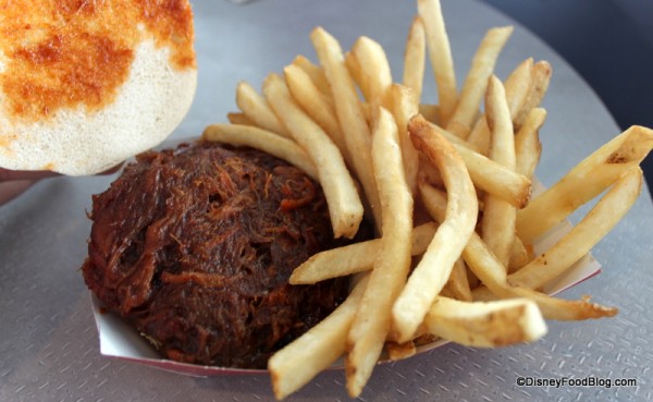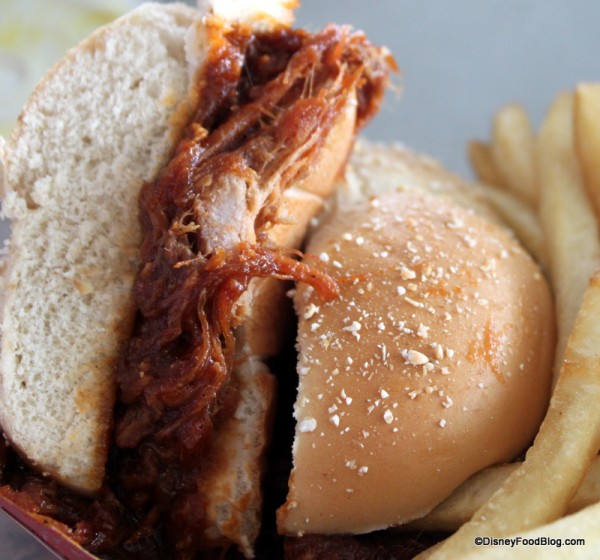 I’d choose the fresh, add-your-own-sauce version at Flametree Barbecue in Animal Kingdom over this one. But if you’re craving a pulled pork sandwich, this should fill the bill.