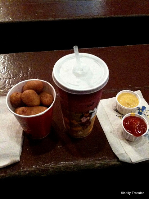 No trip to Magic Kingdom at Walt Disney World is complete for me without a stop at Casey’s Corner. And every visit must include Corn Dog Nuggets! (With lots and lots of ketchup and plastic cheese. Well, Kelly says that’s yellow mustard, but I don’t believe her. Why would you have corn dog nuggets with no plastic cheese?)