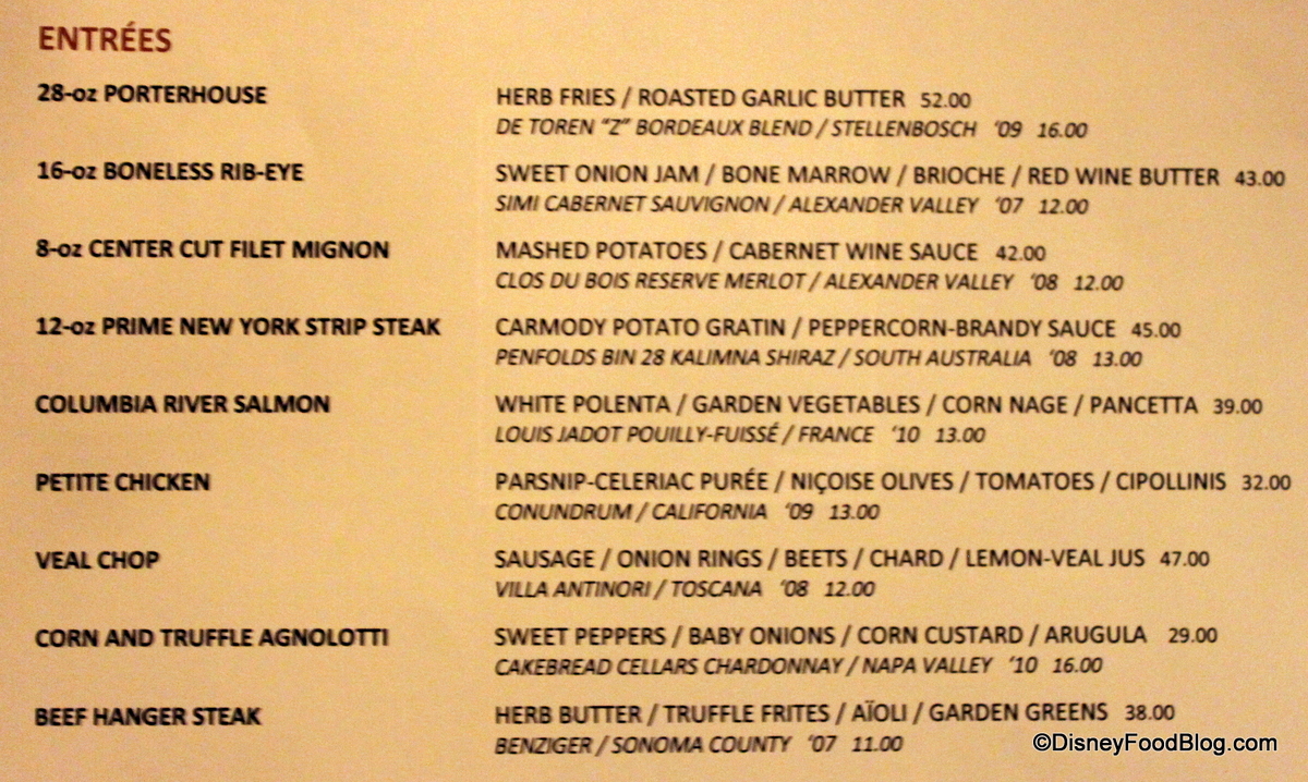 As is the trend with many signature restaurants, there is an emphasis on seasonal offerings; so some of the dishes that you see here probably won’t be on the menu when you head to Yachtsman. But if they aren’t, you’ll find similarly intriguing options during your visit! (For current offerings, be sure to visit our Yachtsman Steakhouse restaurant page, where you’ll find all updated menu links.)