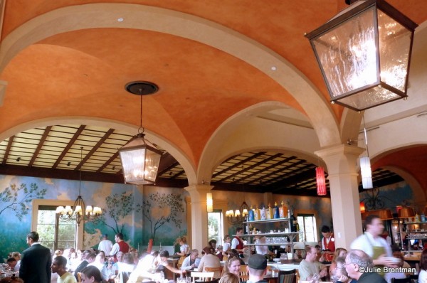 I’ve eaten here several times and it’s always delicious. The melon/prosciutto pizza is my favorite, too! All of the pizza sizes are very generous. I ate here with my mom last month and we split the eggplant caponata appetizer (which was excellent) and an individual size pizza. It was more than enough for the 2 of us. They make excellent cappuccino, too (and it comes with a small, thin biscotti). The servers are very friendly and make me personally want to jump on the next plane to Italy! But I’ll settle for Epcot Italy for now 🙂